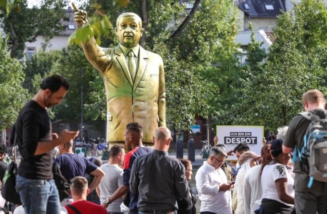 В немецком городе Висбаден на золотая статуя Реджепа Эрдогана спровоцировала конфликт. Власти города в спешке убрали монумент, на котором неизвестные написали «турецкий Гитлер». Отмечается, что среди конфликтующих заметили людей, готовых применить холодное оружие. Золотая статуя высотой 4 метра была размещена на муниципальной площади в рамках фестиваля искусств «Биеннале». Организаторы отметили надежду на дискуссию, соответствующую теме выставки. В этом году фестиваль проводится под титулом «Плохие новости». Вместо простого разговора возникло опасное напряжение между сторонниками и противниками политики президента Турции Эрдогана. Городской советник Оливер Франц рассказал, что споры достаточно быстро переросли в потасовки с применением физической силы: «По согласованию с государственной полицией мэр Свен Герих решил удалить статую, поскольку безопасность больше не может быть гарантирована» В Германии присутствует значительное турецкое меньшинство. Эти люди относятся к Реджепу Эрдоган