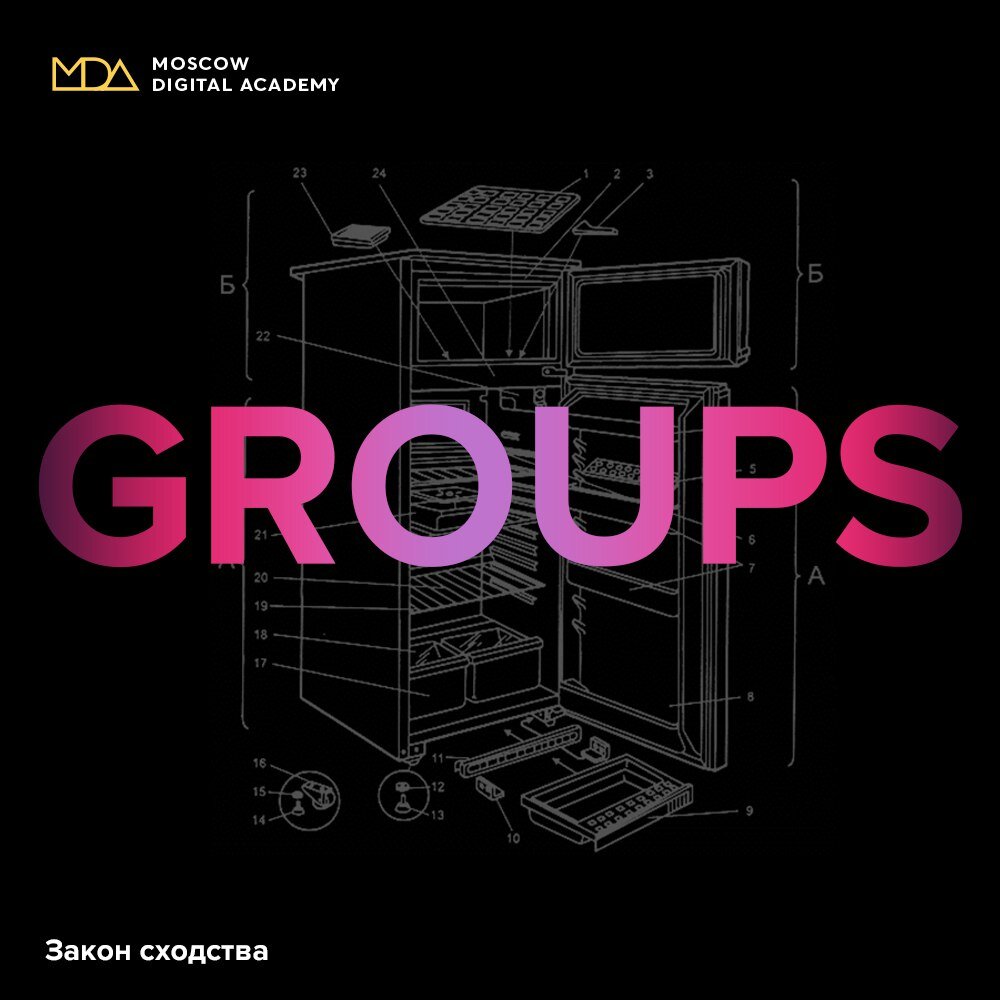 Закон сходства — это основной принцип в гештальт-психологии. Он говорит о том, что люди любят группировать подобные предметы вместе. Вспомните, как вы организовываете пространство в холодильнике. У вас, наверняка, есть полка для фруктов и овощей, вторая — для напитков, а третья — для йогуртов.