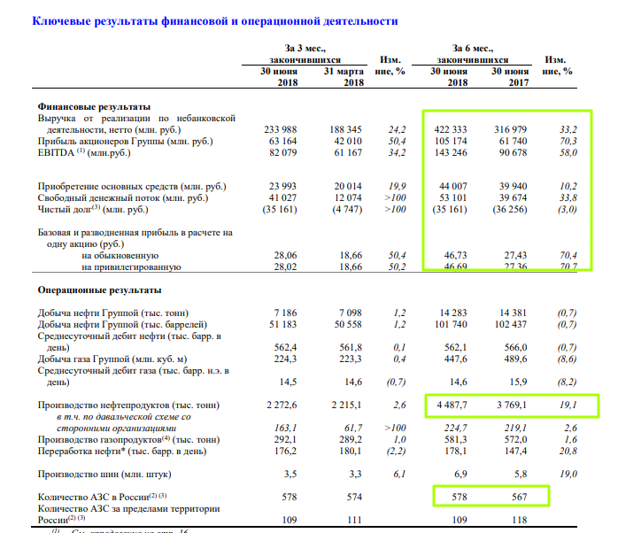 За шесть месяцев 2018 года консолидированная выручка от реализации и прочие доходы от основной деятельности за вычетом экспортных пошлин и акцизов составили 422 333 млн. рублей (7 116 млн. долларов США) по сравнению с 316 979 млн. рублей (5 466 млн. долларов США) за шесть месяцев 2017 года.