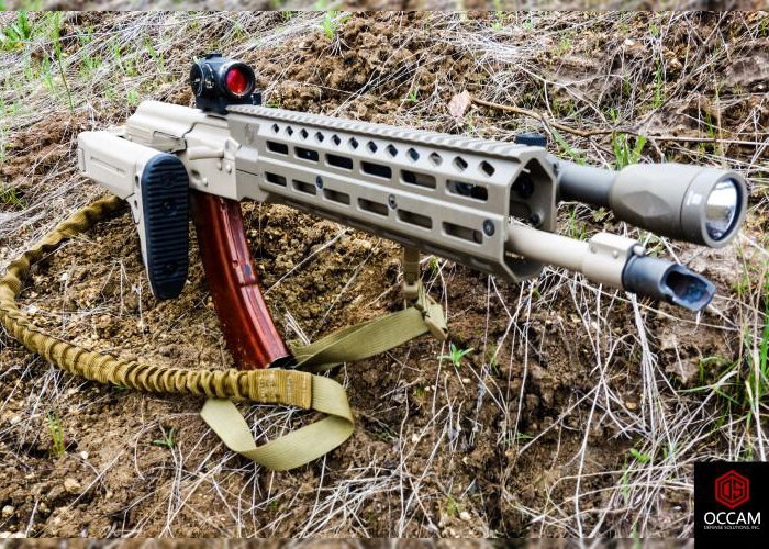 OCCAM Defense Solutions недавно выпустили новое вентилируемое "цевье" MERC для карабинов типа АК с интегрированной длинной верхней планкой picatinny для установки оптических комплексов и слотами M-Lok для дополнительных аксессуаров, расширяя функциональность проверенной временем винтовочной платформы. Запатентованная жесткая цельная конструкция, выполненная из анодированного алюминия марки 6061, не затрагивает ствол и значительно уменьшает тепловое воздействие на удерживающую руку, исходящее от раскаленного ствола, показывая в полевом тестировании на 30°С меньшую температуру по сравнению со схожими моделями конкурентов. Полная длина детали весом 453 грамма составляет 29,8 см, которая также заходит на крышку "ствольной коробки" на 6,35 см по направлению к стрелку, а в ширину и высоту цевье 3,9 и 6,6 см, соответственно. Установка со снятием прицельного блока целика не потребует доработок и специальных инструментов, а также в комплекте будут идти две ствольные гайки. Рекомендованная стоим