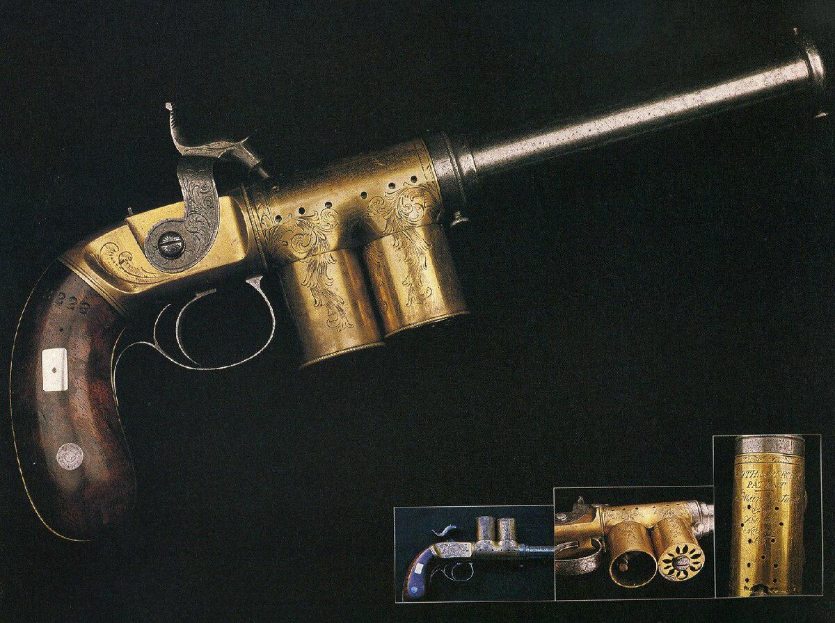 Если я правильно понимаю описание из патента, цилиндр спереди содержит 24 пули, а цилиндр за ним - порох и капсюли. Перед выстрелом владелец взводит курок, поворачивает камеры на 180 градусов. Из них в ствол попадают порох с капсюлем и пуля, затем пара зарядных цилиндров возвращается в прежнее положение, и это оружие, запатентованное в 1850 году готово к выстрелу.
