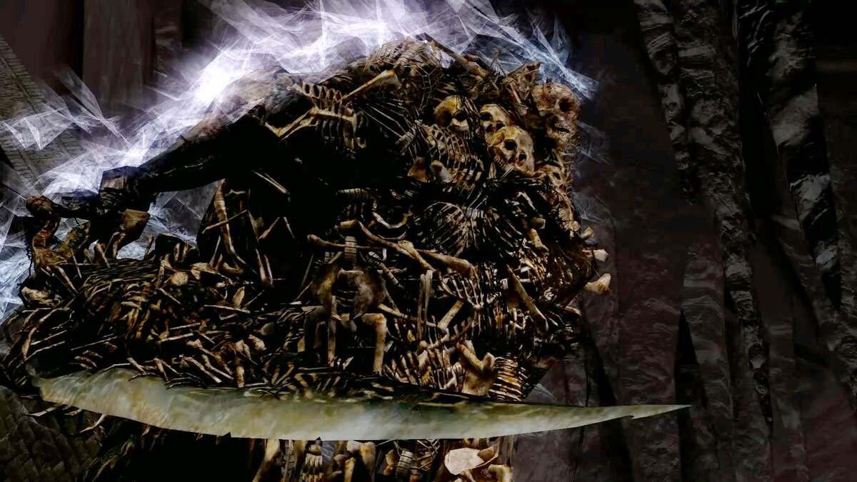(3) Вылезаем по лестницам, юзаем источник света и идем. По пути собираем ништяки, аккуратно держимся на обрывах. Доходим до открытой гробницы, рядом с которой бьют лучники. Там много ништяков, но и много великанов. Пойдете туда – решайте сами. Вправо от гробницы будет костер, у которого можно зацепиться. Подняться по лестнице и пройти прямо – вы окажетесь у обрыва. Там находится уже знакомый нам Лоскутик. Наплетет с три короба про клад, едва только мы встанем на обрыв, спихнет нас с адским смехом. Если вернуться туда, то он извинится, при нежелании мириться с ним подарит человечность и в будущем появится в Храме Огня. Собираем ништяки на дне ямы, убиваем опустошенных Винса и Нико. Значит, Рея рядом. Поговорим с ней, в будущем при определенных условиях она появится в Храме Огня. Кстати, если спрыгнуть вниз, где виднеется свет от ништяка, по узкой тропе можно будет пройти и взять Кольцо с серебряным змеем, увеличивающее фарм душ. При этом вокруг нас появятся костяные башни – страшные противники, когда начинают хаотично бить множественные руками. Но можно их вырезать и с пары ударов. Из ямы идем вбок, бьем по иллюзорной стенке и вновь оказываемся недалеко от костра. Нам надо двигаться, ориентируясь на вид Озера Золы (Озеро Золы и Руины Демонов просвечивают в данной локации, по ним можно определять стороны). Дорога пойдет вниз, попадется вам лучник и скелет-чудовище. Его броска вперед следует остерегаться, в остальном убивается не очень сложно. В том районе будет костер, от него уже путь будет прост. Сбегаем вниз, побивая скелетов-монстров, падаем вниз в небольшую яму и выходим на обрыв, где открывается вид на Озеро Золы. Если мы в человеческой форме, то на нас нападет фантом Паладина Лироя, убивается достаточно быстро. Получаем ништяки и заходим в сталактитовую пещеру, ведущую к Повелителю Мертвых. По дороге не забываем убить ящерку. Башня, башня, лучник и скелет-великан, две башни позади. Ничего сверхсложного. Дальше уже интереснее. Пять слуг Вихря, кастующих неприятные шарики и постоянно оживляющие мелких скелетиков-детей. Эту локацию называют крутым местом для фарма душ и человечности, но мне слабо верится. Эффективнее фарм в Саду, человечность фармится на тех же крысах. А мелкие твари еще и травят токсином – аки пигмеи в Чумном городе. Так что нет. Сзади в маленькой пещерке лежит кусок белого титанита. Вещь нужная, не забываем брать.