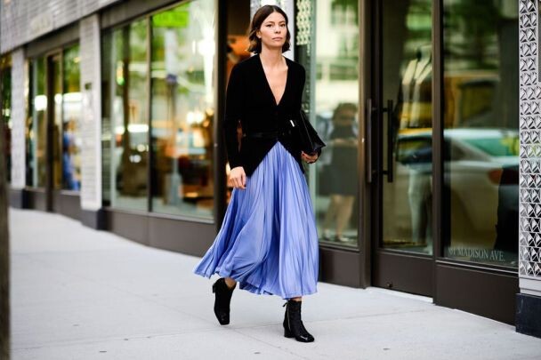 Еще один яркий вариант для теплой осени: юбка длины 7/8, удобные «лодочки» на небольшом каблучке и тонкий облегающий свитер, водолазка или поло.