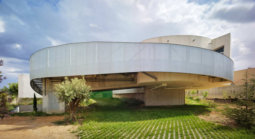 Этот необычный дом построен в пригородном районе испанского города Мурсия. Авторы постарались придать плоскому плану третье измерение, завернув его кольцам вокруг центрального двора. Следствием такого решения стал последовательный повышающийся план: с одного края спирали и слева от входа расположена спальня, далее, направо, следуют кухня, столовая и гостиная, далее по коридору ещё три спальни и выход на находящейся наверху бассейн с террасой. Основу конструкции составляют стойки и балки из монолитного бетона, в качестве дополнительных несущих конструкций и ограждения использован металл, а дерево интерьерах добавляет теплоты и уравновешивает баланс с индустриальными элементами. Название: Интровертный Дом (Introverted House)