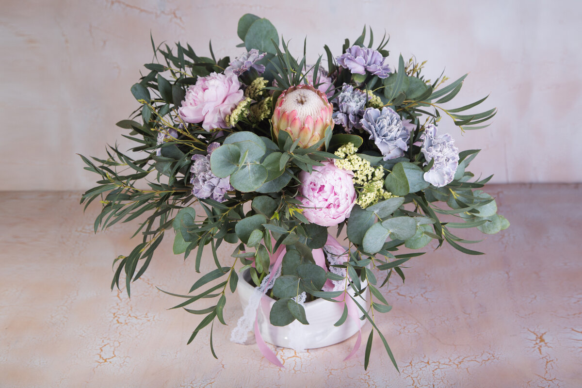 - пион, протея, гвоздика, ахилея, эвкалипт, эвкалипт "Парвифолия"