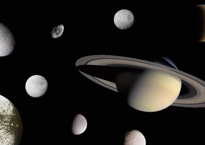 У Сатурна больше спутников, чем у любой другой планеты Солнечной системы. Уже к концу XX века их было известно более двух десятков, и наверняка этот список неполный: тела небольших размеров еще предстоит открывать. Из крупных спутников ближе всего к планете находится Мимас. На его поверхности хорошо различим огромный кратер Гершель, диаметр которого составляет чуть ли не треть диаметра спутника. Образование его связывают с падением на поверхность гигантского метеорита, едва не расколовшего Мимас на части. Спутник Энцелад - самое светлое тело в Солнечной системе. Его поверхность отражает почти 100% падающего на нее света. По-видимому, она покрыта слоем очень светлого инея, который к тому же обновляется. Это говорит о продолжающейся геологической активности спутника. На его поверхности видны как метеоритные кратеры, так и следы внутренних процессов. Еще более эти следы заметны на поверхности спутника Дионы. А вот Рея, напротив, выставляет поверхность, сплошь усеянную кратерами. Между орб