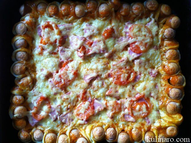 Готовое тесто для пиццы (по этому ленивая) раскатать, перенести на смазанный растительным маслом противень. По периметру положить сосиски, защипнуть тесто, сделать разрезы и перевернуть сосиски с тестом (поставить как «пенечки»). Смазать тесто в том числе и края растительным /оливковым маслом. Затем приготовить соус: майонез + кетчуп (я беру 1:1) и все хорошо промазать. Раскладываем в центр будущей пиццы начинку, я всегда импровизирую, в этот раз у меня начинка состоит из вареной колбасы, ветчины, копченого сыра (колбасного), бланшированных помидор. Сверху обильно посыпаю сыром. Отправляю в разогретую до 180 -190 г духовку на минут 20 -30 в зависимости от толщины пиццы (от количества начинки). Приятного аппетита!