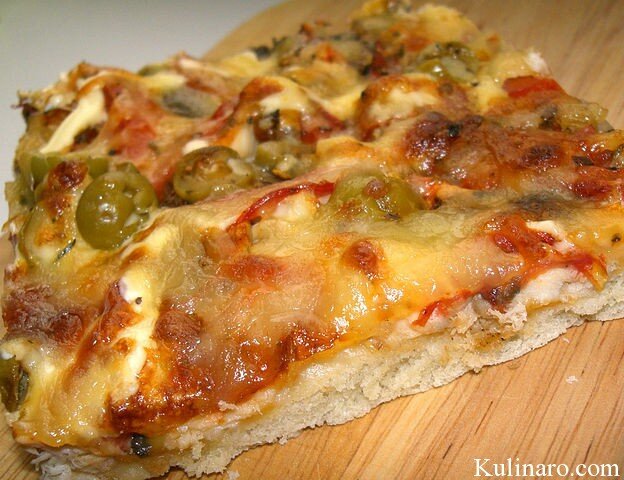 1ст.л. сахара вода — 250 мл. Начинка: филе запеченного пеленгаса, шампиньоны, помидоры, моцарелла, оливки, соль, перец, сух. орегано и базилик. Дрожжи перемешать сахаром и залить 1 ст.л. теплой воды. Просеять муку, добавить соль, масло, теплую воду и дрожжи, вымесить тесто, оставить на 30 мин. Раскатать тесто, выложить на противень, смазать кетчупом пополам с майонезом, выложить начинку, посыпать тертой моцареллой и оливками. Выпекать при темп.200 — 30-40 мин.
