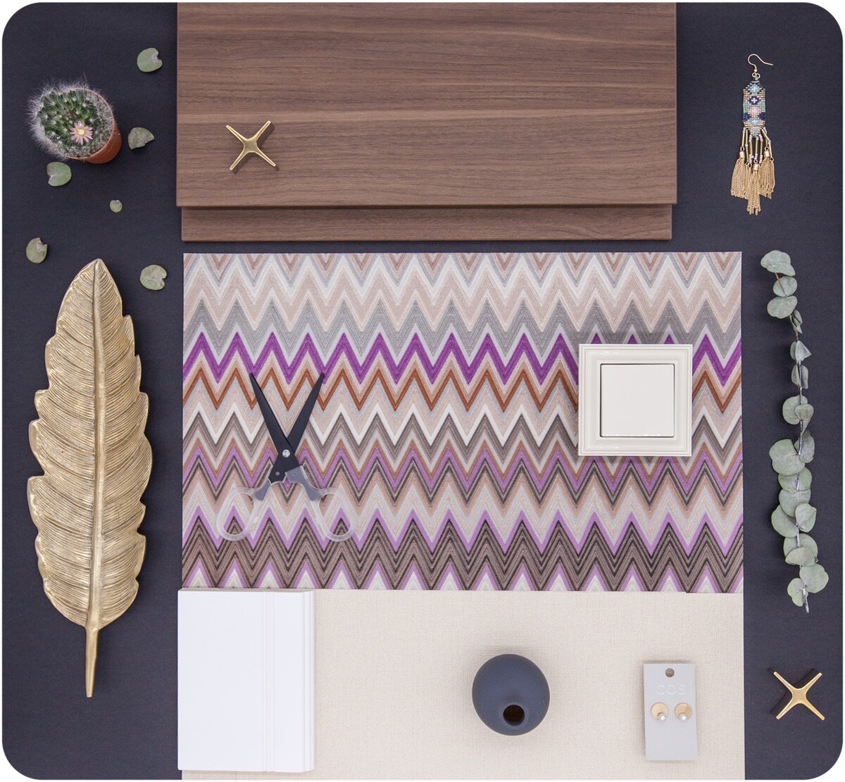 Не боитесь? Тогда вперед! Только, пожалуйста, не раскупите все, чтоб нам тоже хватило. А то было уже такое, показали интересную штуку, а потом сами же для своего же объекта купить не смогли. Обои (шевроны) — Missoni Home Wallcoverings01 арт. 20062 Обои (однотон) — Missoni Home Wallcoverings01 арт. 20035 Выключатель — Jung ECO Profi Deco Плинтус — Европласт арт.1.53.103 Фасад — Икеа Метод Воксторп Ручки-крестики — Zara Home Лист — H&M Home Сережки — Cos, H&M Ножницы (дизайнерская канцелярия — наш фетиш ) — Muji Обои (шевроны) — Missoni Home Wallcoverings01 арт. 20065