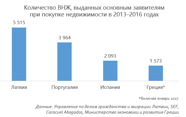 Программа Латвии, лидера по количеству выданных ВНЖ, была крайне популярна в первые пару лет, пока в 2014 году Сейм не принял поправку о повышении порога инвестиций, необходимых для получения визы. Испания и Португалия пользуются стабильно высоким спросом среди состоятельных иммигрантов, а мальтийская программа только набирает обороты: она была введена в августе 2015 и по общему количеству выданных «золотых виз» пока несопоставима с другими странами.