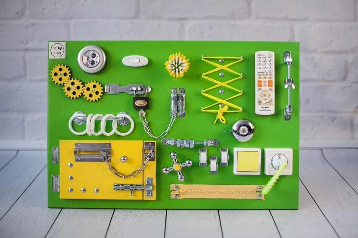 С бизибордом ребёнок может начинать играть уже с раннего возраста. Но чем старше он становится, тем сложнее должны быть элементы на этой развивающей доске.