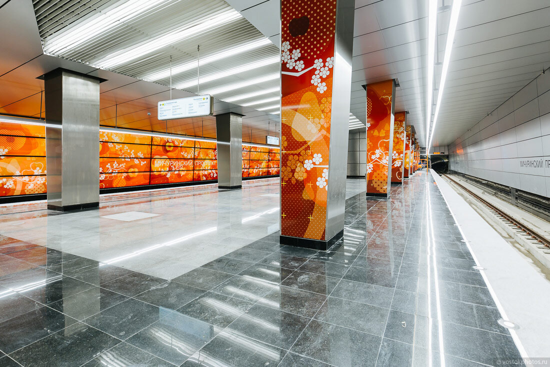 02. В перспективе здесь будет пересадка с одноимённой станцией на Большой кольцевой линии, работы по которой уже начаты китайцами. "Мичуринский проспект" — первая полуподземная станция в Московском метрополитене.
