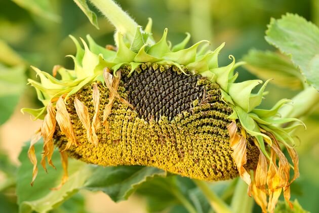 Полновесные семена подсолнечника можно получить при подзимнем посеве. Если эту работу провести осенью, не нужно тратить на посев семян этой культуры драгоценное весеннее время. Три года назад ранней весной заметил крепкие всходы подсолнечника, появившиеся из случайно оброненных семечек, которые в дальнейшем дали превосходные наполненные семенами корзинки. Теперь для посева отбираю крупные полновесные семена, высеваю их на глубину 3–4 см поздней осенью, когда почва ночью уже хорошо подмерзает. В лунки вношу перегной, добавляю немного золы и засыпаю такой же землей. Сверху накидываю немного сена, которое служит отличным снегозадержателем. Если после посева наблюдается длительное потепление, то с наступлением морозов семена заделываю в почву повторно. Весной, когда зацветают черемуха и одуванчик, появляются проростки подсолнечника, которые выдерживают снижение температуры до 6 градусов. Если заморозки усиливаются, растения укрываю лутрасилом, а почву мульчирую перегноем. Летний уход закл