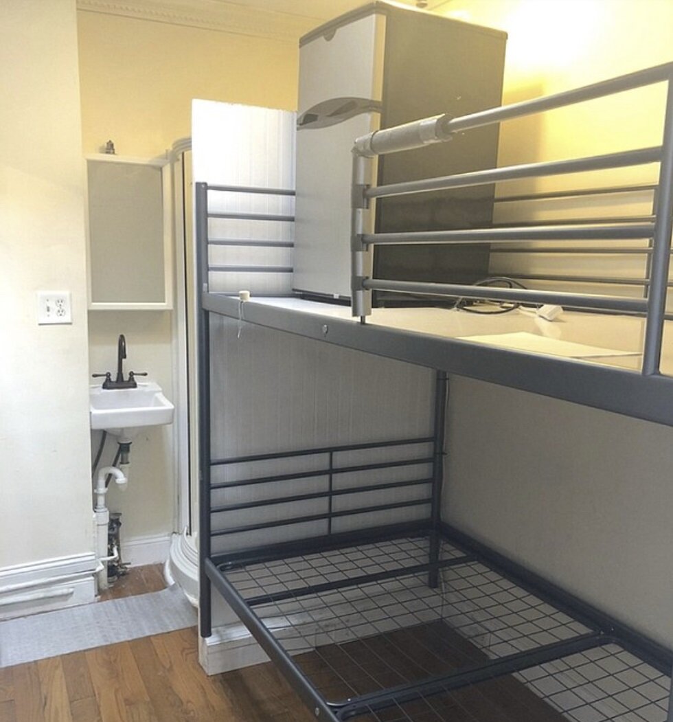 Микро-квартира без окон и холодильником на кровати в Нью-Йорке