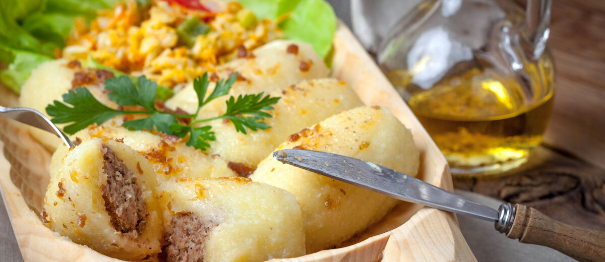 Цепелины - это блюдо литовской кухни. В Литве очень часто встречается это блюдо, его можно встретить почти в каждом литовском ресторане или кафе. Так, что же представляют из себя цепелины. Цепелины-это картофельное тесто с мясной начинкой. Для приготовления цепелин понадобится: 2 кг картофеля, 150-200 гр копченного шпика, 3 ст ложки сметаны, соль, мука, 1 ст ложка молотых сухарей 2 луковицы мука Отварите полкилограмма картофеля и горячим протрите через сито. Оставшийся картофель (1,5кг) надо натереть на мелкой терке и отжать, дайте жидкости отстояться, а затем слейте воду. Добавьте в картофельную массу сметану густую, соль и протертый вареный картофель. Из полученной массы надо сформовать пробную клецку. Узнать нужна ли еще мука или нет можно так: если при кипячении она не расплывется, муку не добавляйте. Для приготовление фарша нарежьте мелко копченый шпик, обжарьте с мелко нарезанным луком и добавьте сухари. Разделите приготовленную картофельную массу на небольшие комочки