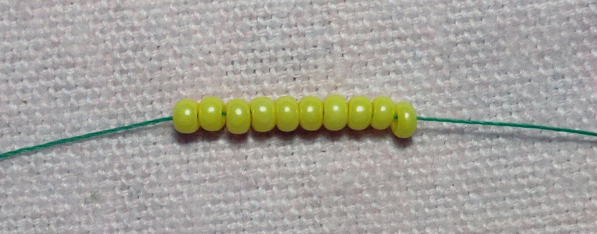Рассмотрим один из способов плетения полотна ндебеле, кратного двум бисеринам. В этом способе плетения рисунок "ёлочка" сразу заметен. Я набрала на нитку 10 бисерин. Первый ряд. Набираем желтую (1*) бисерину и проходим иглой через 10ю. Пропускаем 8ю и 9ю и проходим иглой через 7ю. Набираем 2 бисерины (3* и 2*) и проходим иглой вначале через 6ю бисерину, затем через 3ю. Набираем 2 бисерины (4* и 5*) и продеваем иглу через 2ю бисерину. Первая бисерина начального набора остается не проплетенной. Нужно вставить иголку в нитку слева и продеть один раз через первую бисерину. Таким образом создается т.н. "закрепка", чтобы бисерина никуда не делась. Выдеваем иглу из нитки слева. Для перехода на следующий ряд, продеваем иголку с основной ниткой через самую верхнюю бисерину (5*). Второй ряд. Набираем первые 2 бисерины нового ряда (1` и 2`) и проходим иглой через 4* и 3* бисерины предыдущего ряда. Набираем еще 2 бисерины (3` и 4`) и проходим иглой через 2* и 1* бисерины предыдущего ряда. Сно