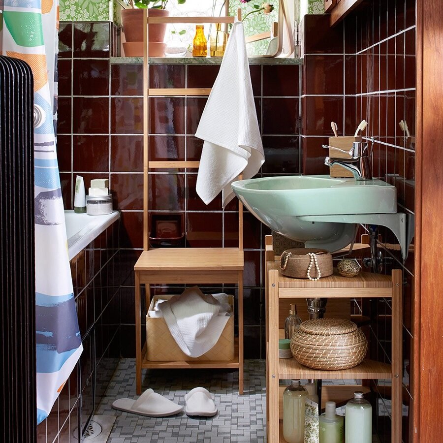 Оригинальное решение, которое занимает немного пространства, при этом добавляет тепла всему интерьеру маленькой ванной комнаты. Дерево в ванной – всегда плюс уюту!