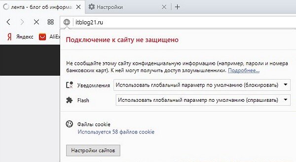 Во-вторых, о каждом сайте можно получить более подробную информацию: тип соединения, Flash, уведомления, куки.
