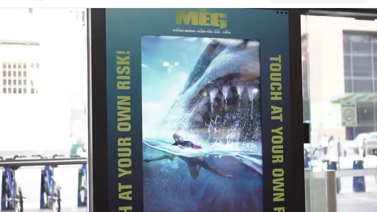 Австралийская медиа-компания Village Roadshow превратила Digital Signage панель JCDECAUX INNOVATE на железнодорожной станции Southern Cross в Мельбурне в интерактивный промо экран для поддержки проката нового фильма про огромную древнюю акулу Мегаладон. Панель JCDECAUX INNOVATE оснащена сенсорным ЖК-экраном, который отображает таинственную, мутную глубоководную сцену, когда экран не используется.