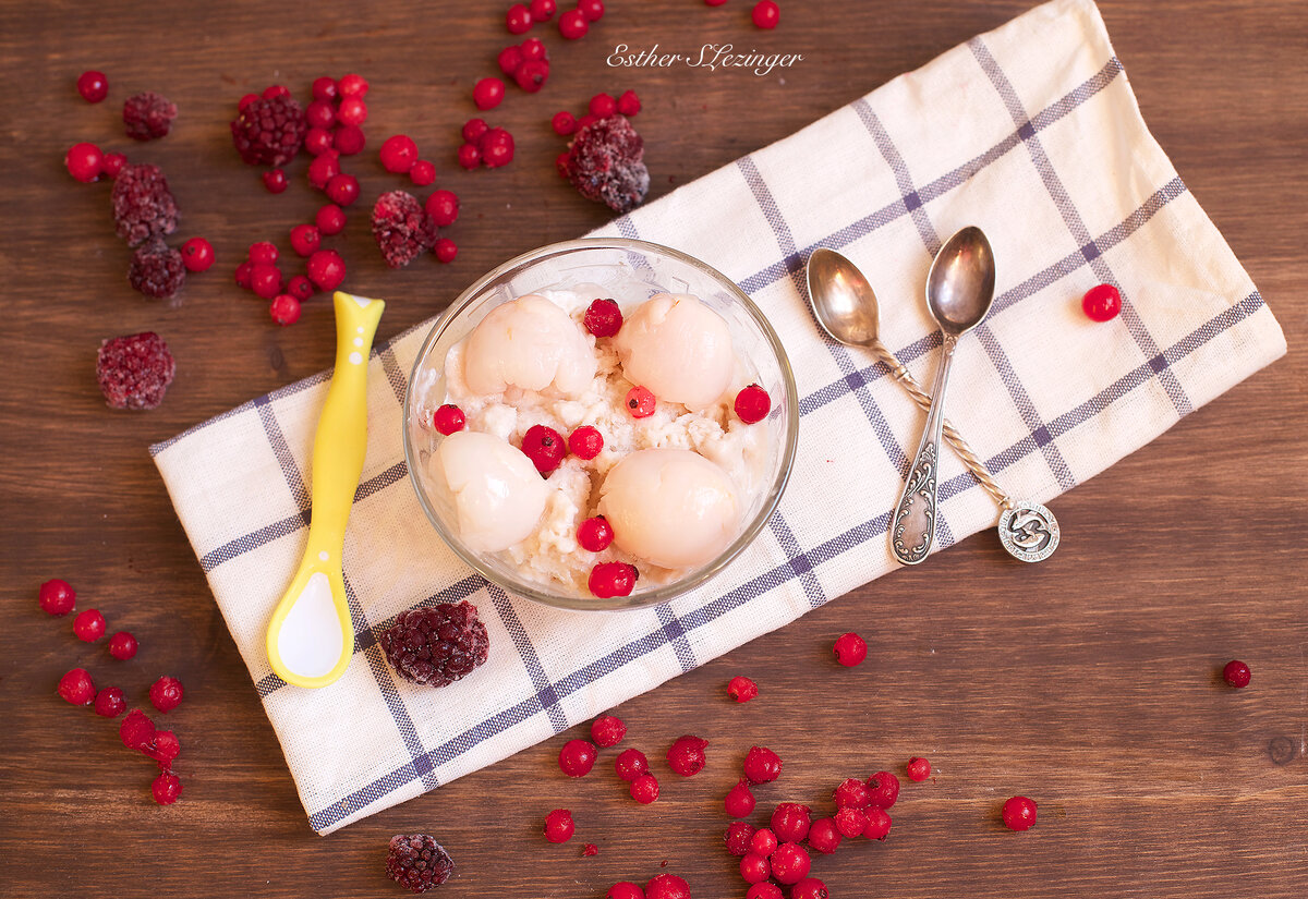 сах.зам. Рецепт диетического домашнего мороженого: Банан взбить в блендере, добавить йогурт и сах.зам. или любой подсластитель. Можно добавить еще любые ягоды или фрукты, но я сделала просто с бананом. Все хорошо смешать и отправить в морозилку. Очень важно: каждые час-полтора надо доставать мороженое и перемешивать, чтобы мороженое не превратилось в "камень". Все это проделать надо 4-5 раз. Через 6-7 часов мороженое уже будет готово. Я приготовила домашнее мороженое вчера и оставила в морозилке на ночь. С утра меня ждал один большой кусок льда. Я по началу очень расстроилась, что мороженое не получилось. Поставила на полторы минуты в микроволновку, и оно стало нужной и правильной консистенции - осталось только хорошо перемешать. Сверху я добавила личи, покупные из банки. Не забывайте, что это еще +калории. Можно полит