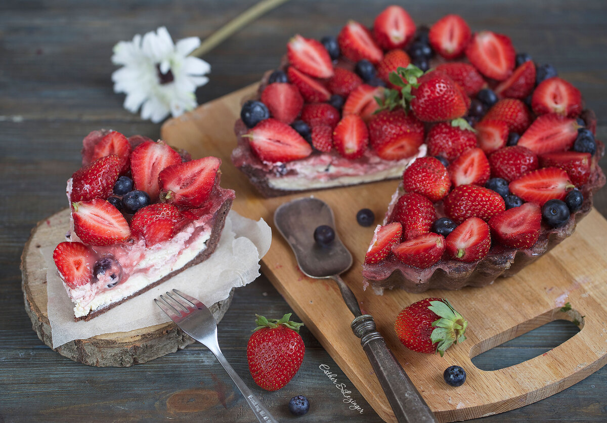 Сах.зам. по вкусу Рецепт диетического творожного пирога с клубникой и голубикой: