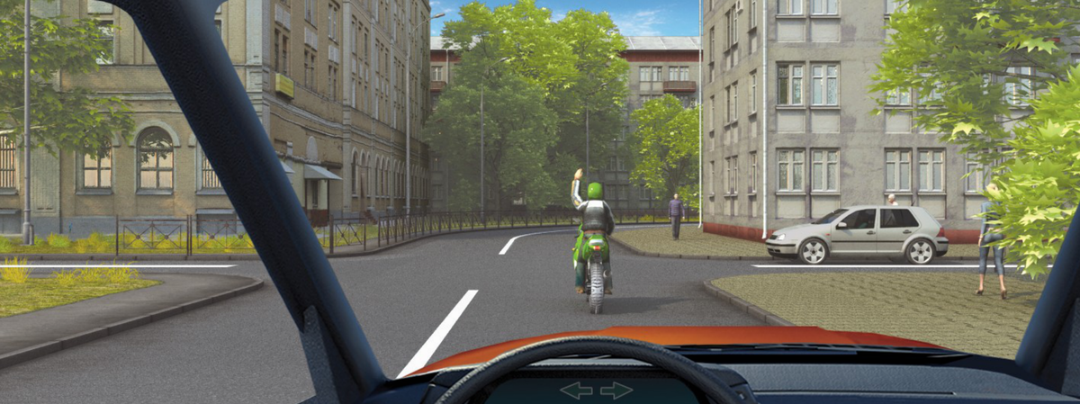 Поднятая вверх рука водителя мотоцикла является сигналом, информирующим Вас о его намерении: