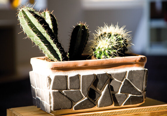 „Ура, мой маленький зеленый кактус стоит на балконе!“ Вы по достоинству оцените, как хорошо будет вашим колючим друзьям и разнообразным цветам в прекрасном ящике с мозаикой. Внутри дома или снаружи – в нем любое растение будет чувствовать себя замечательно! шаг 1 - Укладываем мозаику Отделите натуральные камни от подложки. Выложите мозаику на одной стороне ящика, чтобы образовалась ровная поверхность. Этот процесс похож на сборку пазлов! шаг 2 - Наклеиваем мозаику Постепенно, один за другим приклейте камни с помощью клея для натурального камня к ящику. Повторите на других сторонах ящика. Следите за тем, чтобы на углах был плавный переход. шаг 3 - – Заполняем швы После высыхания заполните все швы клеем для натурального камня. Влажной тряпкой или губкой удалите лишний клей. Дайте хорошо высохнуть. С помощью средства для очистки кастрюль очистите камни от остатков клея. Теперь можно засаживать ящик растениями! Вместо натурального камня можно использовать черепки керамических плиток, ос