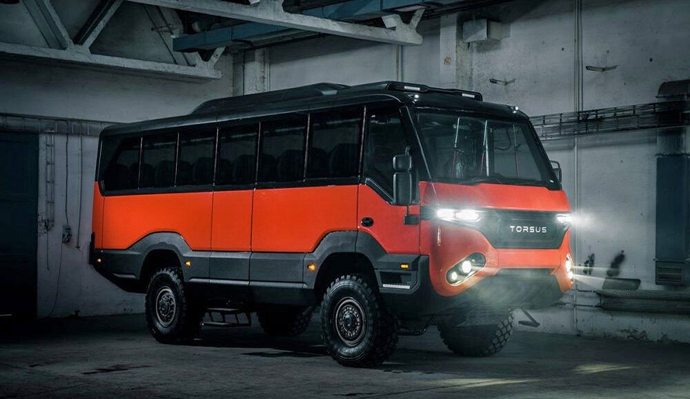 Массивный внедорожный автобус Torsus Praetorian от компании Pulsar Expo создан для покорения труднопроходимых местностей и суровых ландшафтов. Он разработан для перевозки людей к месту работы в условиях абсолютного бездорожья. Автобус вмещает в себя до 35 пассажиров плюс багаж или какое-либо другое оборудование. Дорожный просвет составляет 400 мм, а максимальная глубина преодолеваемого брода – 700 мм. Это транспортное средство идеально подходит для тех, кто занят в нефтегазовой, лесной или горной отраслях, а также для ликвидации последствий чрезвычайных ситуаций и катастроф, сафари, экспедиций, горнолыжных курортов и т. п. Torsus Praetorian укомплектован 6,9-литровым шестицилиндровым дизельным двигателем мощностью 240 лошадиных сил (176 киловатт) с крутящим моментом 925 Ньютон-метров. Максимальная скорость автомобиля равняется 117 км/ч. Каждое пассажирское сиденье имеет регулировку и трёхточечный ремень безопасности. В салонное оснащение также входит: DVD-проигрыватель с динамиками,