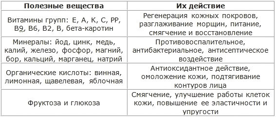 Фитонциды. В мякоти плода в значительном количестве содержатся фитонциды (биологически активные вещества). Их уникальные регенерирующие и противовоспалительные свойства содействуют в заживлении ран и порезов, помогают при лечении кожных воспалений (угрей, прыщей).