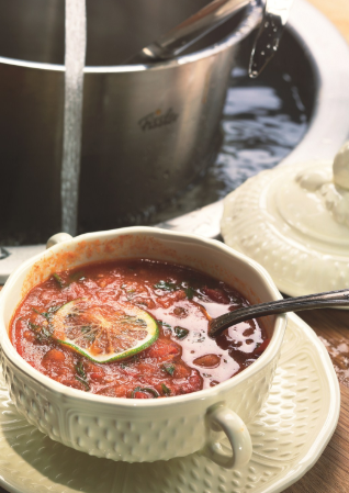 Томатный магрибский суп особенно распространен в Марокко и Тунисе. Он весьма прост в приготовлении и сам по себе легкий — в основе томаты и куриный бульон. Кроме них в супе только необходимые специи, мед и лимон, которые все вместе и передают тот самый восточный колорит. Вкус супа всецело зависит от качества томатов. Нужно брать очень спелые, иначе они не разварятся до нужного состояния. Дополнят блюдо свежая кинза и отдельные дольки лимона. Если суп покажется слишком экзотичным и легким, никто не мешает добавить фасоль или куриное мясо. Ингредиенты Помидоры 1 кг Красный лук 1 головка Куриный бульон 1 л Мед 2 чайные ложки Лимон 1 штука Имбирь 20 г Тмин ¼ чайной ложки Корица ¼ чайной ложки Петрушка 50 г Кинза 50 г Оливковое масло 50 мл Паприка 1 чайная ложка Соль по вкусу Перец черный молотый по вкусу 1. Мелко нарубленный лук обжарить в глубоком сотейнике на оливковом масле с тертым имбирем, молотой корицей, семенами тмина (или зиры). Обжаривать до сильного запаха жарено