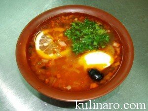 Для приготовления солянки нам потребуются следующие продукты: Мякоть говядины – 250 гр. Мякоть свинины – 250 гр. Головка лука – 1 шт. Морковь средняя– 1 шт. Соленый или бочковой огурец – 2 шт. Томатная паста – 3 ст. ложки Маслины без косточки – 100 гр. Колбаса копчено — варенная – 200 гр. Грудинка копченая – 100 гр. Соль – по вкусу Лимон – 3 кружочка Приготовление блюда: Для того чтобы солянка была вкусной и наваристой нужно правильно сделать основной бульон. Для этого в приготовленную емкость ложится вымытое и отделенное от плевы мясо, заливается холодной водой и варится. В это время морковь и лук очищаются и измельчаются. Морковь трется на крупной терке, лук нарезается полукольцами. После чего овощи обжариваются на растительном масле до получения золотистого цвета. Огурец нарезается небольшими кубиками, маслины тонкими колечками и добавляются к обжаренным овощам. Смесь заливается томатной пастой, разведенной водой или бульоном и тушится на протяжении нескольких минут. После чего
