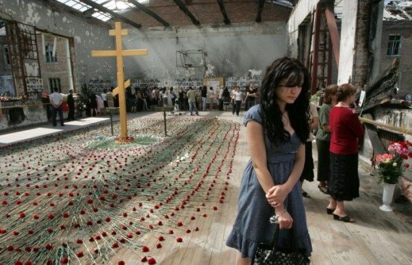 Под звуки траурной музыки люди, молча, приносят цветы и зажигают свечи в спортзале школы №1. Также появляются игрушки и вода возле фотографий погибших. Вода появляется в знак того, что дети и взрослые, которых держали в этом помещении три дня не получали от террористов даже воду, чтобы утолить жажду.
