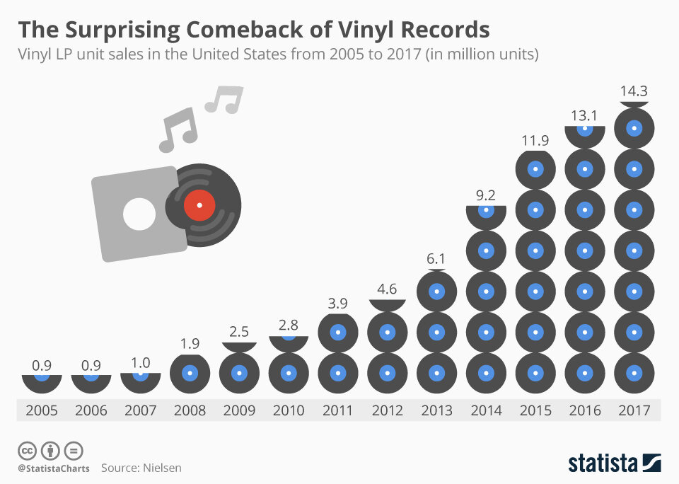 Грампластинки с конца 19 по конец 20 века пользовались большой популярностью в связи с возможностью простого и относительно недорогого массового тиражирования. После появления CD-дисков их производство резко упало, а затем практически сошло на нет. Но на протяжении последних десяти лет продажи винила начали увеличиваться, и в 2017 году в США было продано более 14 миллионов релизов на виниле, причем среди самых популярных не только классические альбомы вроде «Сержанта Пеппера» Битлз, но и саундтреки к «Стражам Галактики» и «Ла-Ла Ленду».
