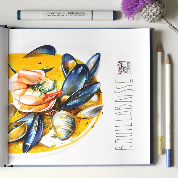 Популярный в последние годы скетчинг — быстрые зарисовки — вполне можно объединить с фуд-фотографией. Вместо того, чтобы делать кадры своим смартфоном, попробуйте зарисовать свою еду. В книге «Скетчинг маркерами с Анной Расторгуевой» рассказывается о том, как сделать свою первую вкусную картинку и почему это занятие вам точно понравится. Почему фуд-скетчинг — это здорово Популярность жанра кулинарных зарисовок связана с модой на фуд-фотографию. Многим нравится фотографировать свой завтрак, обед из трёх блюд, перекус или ужин. Так что можно даже не выходя из дома нарисовать традиционный наваристый борщ или экзотичные устрицы. Рисовать еду можно где угодно. Пойти в кафе и набросать в блокноте капучино и чизкейк. Или привезти зарисовку из путешествия: острый Том-ям или шакшука запомнятся надолго. Даже в беглом скетче можно ухватить самую суть блюда и общее настроение, а занятные комментарии сделают работу еще более памятной. С чего начать? Первым делом нужно выбрать рецепт, который вы соб
