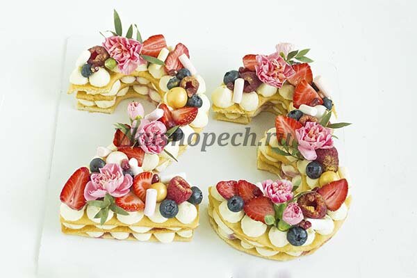 Преимущество такого дизайна в том, что оформить его можно как угодно: придать форму цифры, буквы, сердечка, и в общем-то всего, что подходит под тематику и повод торжества. Можно даже сделать целое слово, или несколько цифр, если того требует отмечаемая дата. Подобное оформление подойдет и для детей, и для взрослых. Коржи получаются очень нежные, и отлично пропитываются даже густыми кремами, такими как крем Чиз, ганаш.