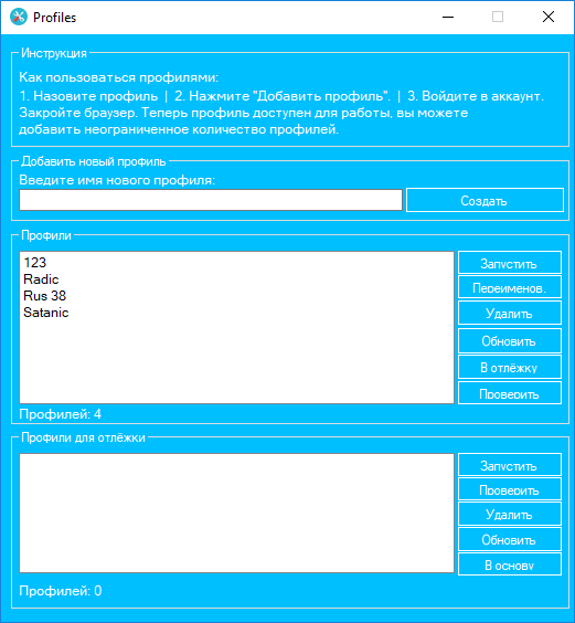 1. Управление профилями. >Как добавить профиль? 1. Открываем управление профилями: 2. Даём имя профилю и нажимаем 'Создать' 3. В открывшемся окне браузера авторизуем УЖЕ СУЩЕСТВУЮЩИЙ аккаунт и закрываем браузер. 4. Нажимаем 'Обновить' и видим наш аккаунт в списке, мы уже можем им пользоваться как угодно. >Как удалить профиль? 1. Выделяем профиль нажатием по его названию: 2. Нажимаем 'Удалить' >Как отправить аккаунт в отлёжку? 1. Выделяем профиль нажатием по его названию: 2. Нажимаем 'В отлёжку' >Как открыть аккаунт с программы? 1. Выделяем профиль нажатием по его названию: 2. Нажимаем 'Запустить' Ошибки: >Просит установить новую версию Google Chrome. 1. Убедитесь, что у Вас установлена Google Chrome последней версии. 2. Убедитесь, что Вы не открыли два окна браузера (то есть закрывайте прошлое окно открытое софтом перед тем как открывать новое) 2. Инвайтер Telegram Tools Как приступить к инвайту? 1. Загружаем слева логины пользователей, кого будем инвайтить: 2. Выбираем с какого про