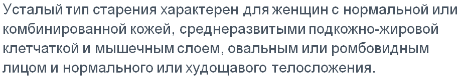 Многие женщины, начиная антивозрастной уход, теряются от огромного количества средств и салонных процедур, которые обещают замедлить старение. Эта статья поможет вам самостоятельно определить свой тип старения и понять, на что нужно обратить прежде всего внимание при выборе косметических средств для эффективного ухода. 1. Усталый тип старения 2. Мелкоморщинистый тип старения 3. Деформационный тип старения (бульдожьи щеки) 4. Смешанный тип 5. Мускульный тип старения Читайте также мои интересные и полезные статьи: -5 простых упражнений гимнастики лица для борьбы с морщинами -Бесплатный аналог инъекциям филлеров и ботокса-фейсбилдинг или как помолодеть на 10 лет бесплатно. -Как убрать мешки под глазами за 10 минут -Как разгладить морщины за 1 раз. Альтернативы ботоксу. Самые популярные статьи: - ТРЕНД КОРЕЙСКОЙ КОСМЕТИКИ-МУЦИН УЛИТКИ - КАК ЗА 2 МЕСЯЦА Я СТЕРЛА С ЛИЦА ВОЗРАСТНЫЕ ИЗМЕНЕНИЯ. - 6 странных суперэффективных ингредиентов для молодости кожи лица - ПОЧЕМУ ВСЕ ПОМЕШ