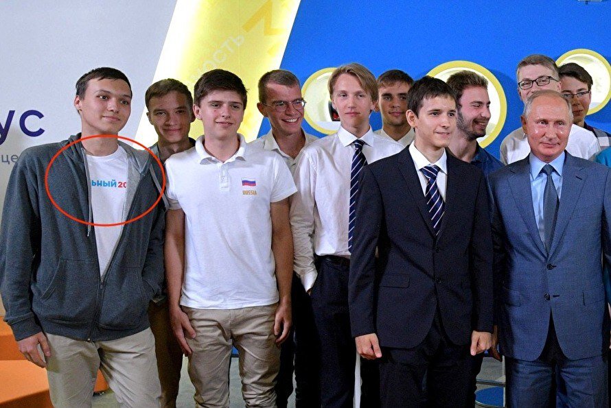Владимир Владимирович давеча встречался с победителями всяких там крутых олимпиад (респект молодёжи) — а заодно сделал с ними совместное фото. И слева в конце притаился интереснейший молодой человек в серой толстовке и белой футболке, на которой было написано… «Навальный20!8». Выяснилось — парнишку зовут Егор Рябов, выпускник московской школы 1329 и студент математического факультета Высшей школы экономики. Парняга хитро прошёл проверки ФСО: толстовкой прикрыл футболку, а в нужный момент немного расстегнул её.