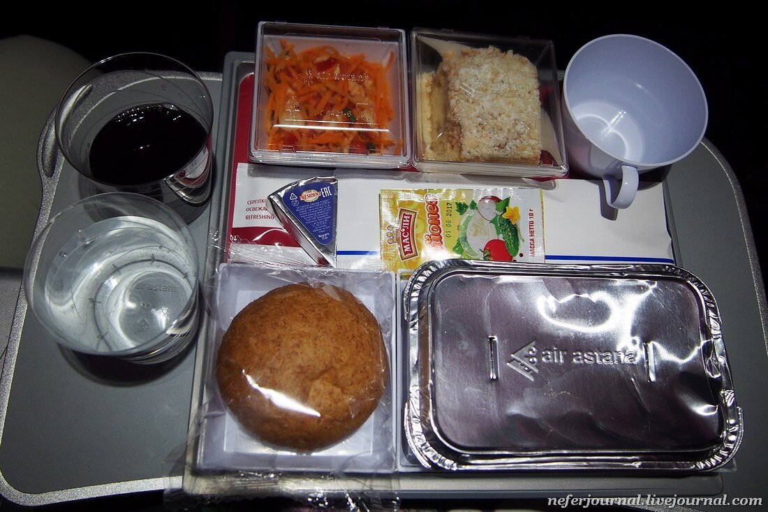 Вот мой ужин. Обратите внимание на напитки. Air Astana предлагает пассажирам эконом-класса вино! Как в старые добрые времена. Приятный такой сюрприз.