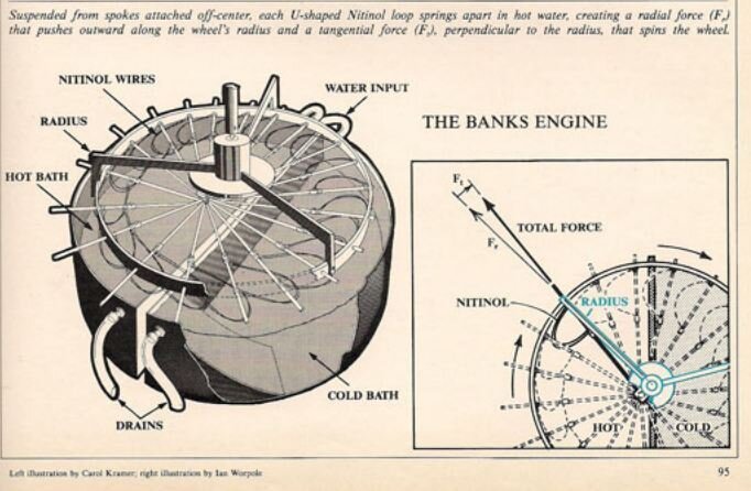Но особый интерес мр.Бэнкс представляет как разработчик тепловых двигателей, использующих особый сплав под названием Nitinol, для получения энергии.