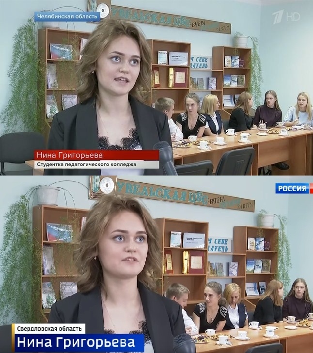 Как можно убедиться по кадрам, это точно одна и та же девушка, в обоих сюжетах она в одной и той же одежде, на том же фоне и снята с одного ракурса. Однако Первый канал представил девушку как студентку педагогического колледжа из Челябинской области, а на России-1 она оказалась уже из Свердловской области.