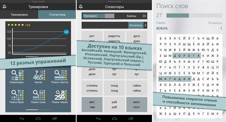 Я бы даже не назвал это приложением, скорее это полноценный курс по обучению навыку скорочтения, в удобной форме. Главным плюсом этого приложения, и его преимуществом перед другими способами обучения этому навыку, является наличие игрового, соревновательного момента. Установите и вы все поймете!