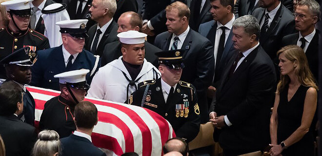 Американский политик и сенатор от штата Аризона еще при жизни начал лично заниматься планированием своих похорон. В своем последнем письме он написал, кто должен нести его гроб, а также создал список лиц, которые должны просовывать на церемонии прощания одним из «приглашенных» стал президент Украины Петр Порошенко. По словам бывшего постпреда США при ООН Саманты Пауэр это своего рода некое послание президенту РФ Путину. Также она отметила что Маккейн «не случайно» поставил украинского главу рядом с генеральным секретарем НАТО Йенсом Столтенбергом. В свою очередь Порошенко произнес речь, в которой поблагодарил Маккейна за поддержку, назвав его другом, который всегда боролся за демократию и свободу. Он напомнил как Маккейн в 26 градусный мороз «раздетый» вышел к людям на Майдане и стал не только героем для Америки, но и для Украины. На официальном сайте Киевской городской администрации предоставлена информация, что одна из улиц Киева будет названа в его честь. Напомним, что политик уме