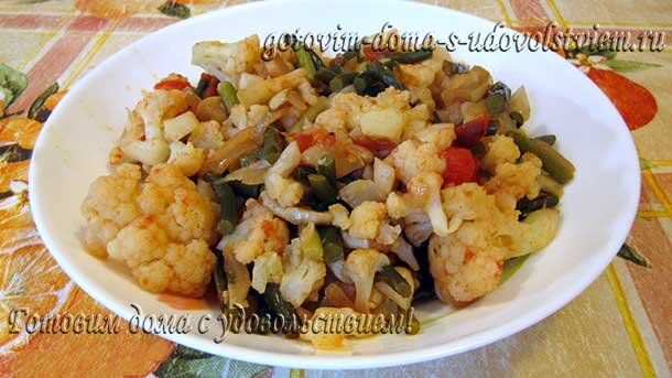 Осенняя пора, золотая осень, теплое бабье лето... Сезон овощей в самом разгаре и можно ими наслаждаться в различных вариантах. Для тех, кто любит овощи - приготовьте этот незатейливый рецепт. Нам потребуется цветная капуста кочан примерно грамм на шестьсот, которую нужно разобрать на соцветия и бланшировать в кипящей воде. Луковицу порубить, обжарить в растительном масле, сюда же добавить половинку кабачка молодого, порезанного кусочками. Добавить соль, перец и любые пряности. Добавить цветную капусту. У меня еще были чесночные стрелки, которые я отварила предварительно и добавила сюда же. Можно вполне обойтись и без них,если их нет. Порезать кубиками помидор, добавить в сковороду плю лавровый лист. Накрыть крышкой и потушить 10 минут. Теперь проверяем на соль, посыпаем щепоткой сахара для вкуса, перемешать и дать постоять немного. Сочные тушеные овощи хороши для летнего легкого ужина с черным хлебушком, подсушенном в тостере и натертым чесночком. Подробный рецепт смотрите здесь, вид