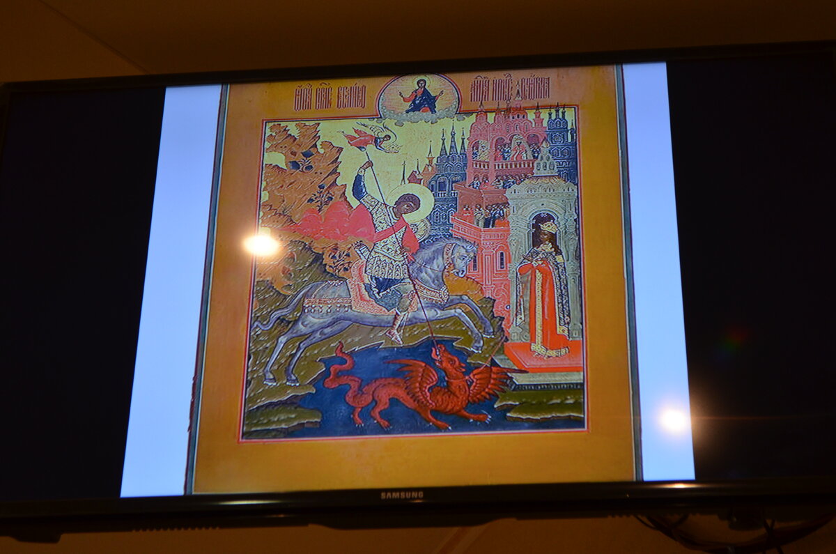 "Святой Великомученик Георгий Победоносец – покровитель воинства. Изображение Георгия Победоносца на коне символизирует победу над дьяволом – “древним змием” (Откр. 12:3, 20:2), изображение было включено в древний герб города Москвы."