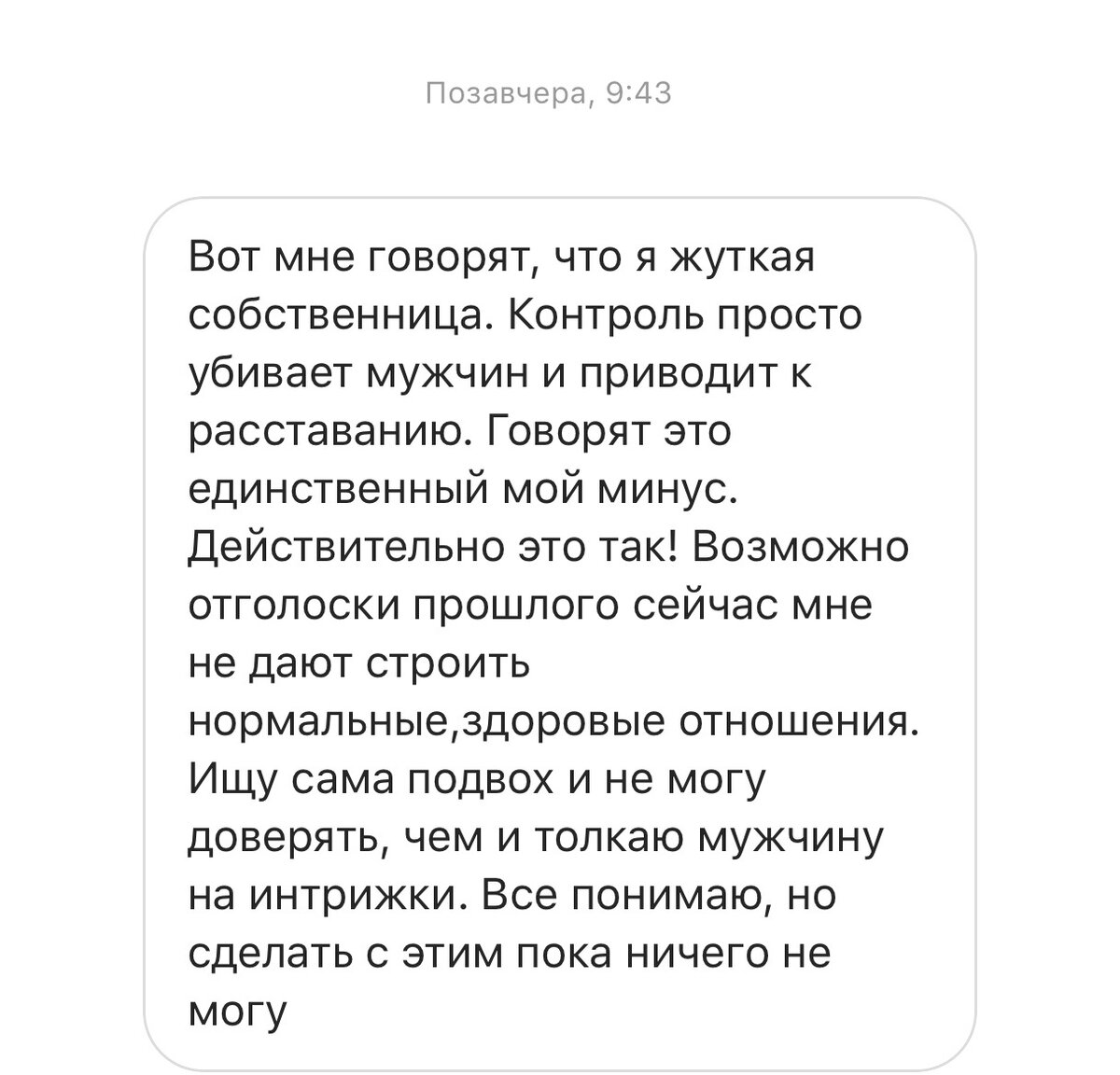 Доброе воскресное утро, правда у нас дождливое, но все равно доброе. А у вас оно какое? Как настроение? Сегодняшняя тема это ответ на вопрос подписчицы, листайте карусель вправо чтобы прочесть его. Тема актуальна для многих, поэтому давайте разберемся в причинах такого поведения. Ревность бывает двух видов, рациональная и иррациональная. Другими словами, в первом случае ревность имеет основания, во втором случае она надуманная. Нас интересует второй случай, так как подписчица ничего не сказала о паролях на телефоне, переписках в туалете и трусиках в кармане пиджака. Первое что хотелось бы отметить это фраза "мне говорят, что я жутка собственница". Кто такой собственник? Это владелец, хозяин чего-то или кого-то. Разве можно быть собственником другого человека? Нет, говоря кого-то, я имел ввиду домашнюю утварь. Любовь – это осознанный выбор двух свободных людей и не может быть речи ни о каком ограничении свободы или жестком контроле. Чего добивается собственница? Она хочет создать "ид