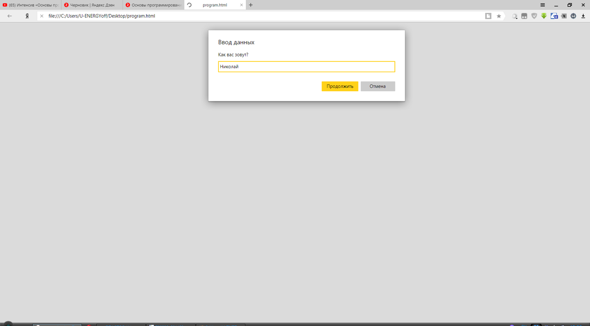 Теперь, сообщение содержит не только текст "Привет", а ещё и имя, лежащее в переменной. Переменные нельзя вписывать в кавычки, иначе компьютер сочтёт их за текст, переменная должна лежать ЗА кавычками, но тогда компьютер просто не поймёт, как использовать эту переменную. Для этого используется плюсик - он складывает содержание кавычек и переменную в один единый текст. Давайте проверим. Компьютер смог поздороваться со мной, т.е. с Николаем. И даже если потом я напишу Андрей, он напишет "Привет, Андрей". Всё работает. Мы с вами сохраняем в переменную (name) и потом переменную и используем. Давайте нормально поговорим про то что такое переменная. Переменная - это контейнер, который просто хранит какую-то информацию. Можете себе представить коробочку, к примеру, под названием "a", и там лежит "1" (a=1). Как мы создадим эту коробочку? С помощью слова let. Нам надо её как-нибудь назвать (a), и что-то в неё положить: let a=1 Равно, это не равно как в математике, это оператор присваивания. Т.
