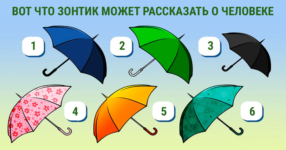 Выберите тот зонтик, который вам нравится больше других, затем посмотрите описание. Зонтик № 1. Вы стильная натура, любите классический стиль в одежде. Вы часто общаетесь в деловых кругах, и заранее планируете свой отпуск. У вас аналитический и рациональный склад ума. Без проблем выполняете любые интеллектуальные задания. Именно этот зонт выполняет задачу учительской указки, которую вы используете при разговоре. Зонтик № 2. Вы современная личность. Для вас важно выглядеть в глазах людей индивидуальной и элегантной натурой. Вы любите нестандартные и оригинальные аксессуары, которые другие бы не выбрали, но для вас это обычное явление. В вас есть энтузиазм и творческие мысли. Зонтик № 3. Вы постоянно стремитесь находиться на всеобщем обозрении. Вы раскрываетесь только с любимыми и близкими вам людьми. К любым вопросом вы подходите с практической стороны, и именно это положительно влияет на вашу жизнь. В плане одежды предпочитаете абсолютно любой стиль, так как вам все к лицу. Зонтик №