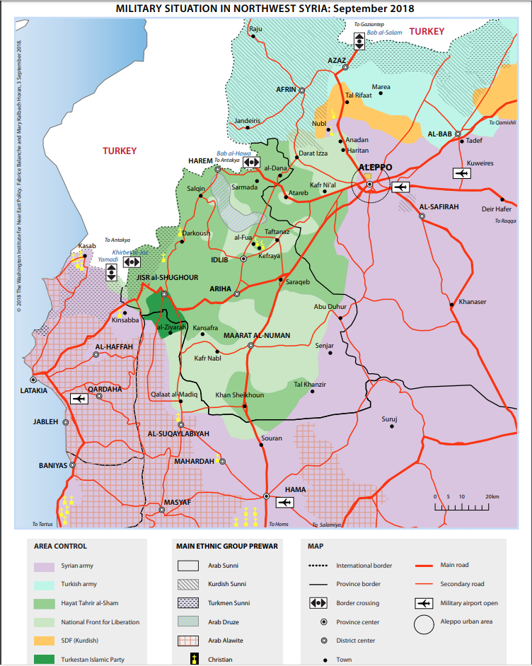 "Хайят Тахрир аш-Шам", иностранные джихадисты, а также "умеренные" исламисты, связанные с Турцией, препятствуют выходу гражданских лиц и терроризируют население. В качестве возможных подходов по защите Идлиба, террористы арестовывают людей, сеют страх перед сирийской армией и русскими среди местного население. Группы мониторинга и местные жители возлагают большую часть ответственности за все зверства, чинимые в Идлибе, на "Хайят Тахрир аш-Шам", ранее известную как "Джабхат ан-Нусра", но также говорят, что поддерживаемые Турцией боевики также десятками арестовывали людей.