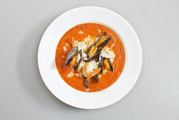 Томатный суп — один из самых популярных гастрономических жанров в мире. Когда этот номер готовился к печати, на сайте eda.ru, к примеру, было целых 146 непохожих друг на друга рецептов томатных супов — острых, сладких, кислых, горячих и холодных. И этот — один из лучших среди авторских, вошедший в десятку победителей конкурса домашних рецептов «Своя Еда». Ингредиенты Помидоры 5 штук Красный лук ½ штуки Красный сладкий перец 1 штука Листья базилика 8 штук Чеснок 1 зубчик Морковь ¾ штуки Оливковое масло extra virgin 2 столовые ложки Моденский бальзамический уксус 2 столовые ложки Помидоры в собственном соку 1 кг Красный соус табаско по вкусу Соль по вкусу Молотый мускатный орех по вкусу Смесь итальянских специй по вкусу Перец черный молотый по вкусу Перец чили ½ штуки Мидии по вкусу Белое вино 200 мл Королевские креветки 1 кг Белый хлеб 6 кусков Сыр грана-падано 100 г 1. Помидоры бланшировать, очистить от кожицы и нарезать кубиками. Красный перец очистить от семян и
